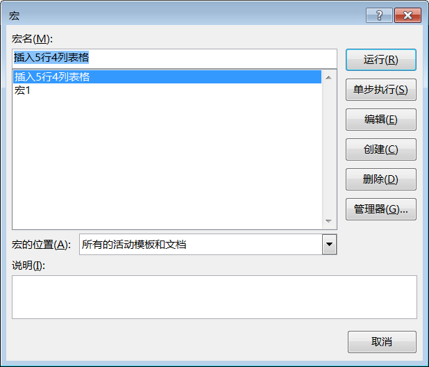 第2步:打开【宏】对话框,在【宏名】列表框中选择要运行的宏,例如选择"插入5行4列表格";单击按钮,如下图所示。