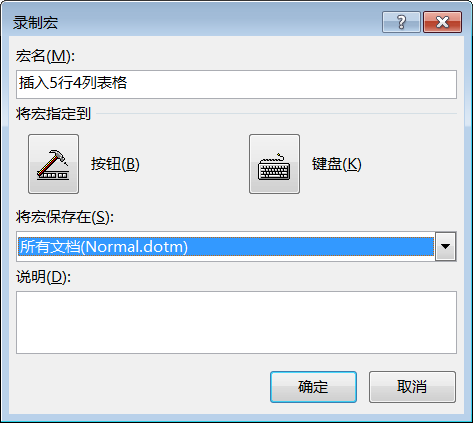 录制宏就是将所完成的操作翻译为Visual Basic代码的过程。默认情况下,Word将宏存储在Normal模板内,这样每一个Word文档都可以使用它,也可以将宏保存在某一个文档中,仅供该文档使用。例如,录制一个在Word文档中插入5行4列表格的宏时, 具体操作方法如下。
