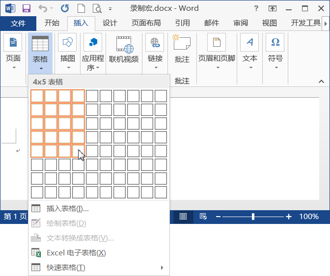 第5步:此时鼠标指针呈形状,表示正在录制宏,切换到【插入】选项卡;在【表格】组中单击【表格】按钮;从弹出的下拉列表中选择要插入表格的行和列,这里选择5行4列,如下图所示。