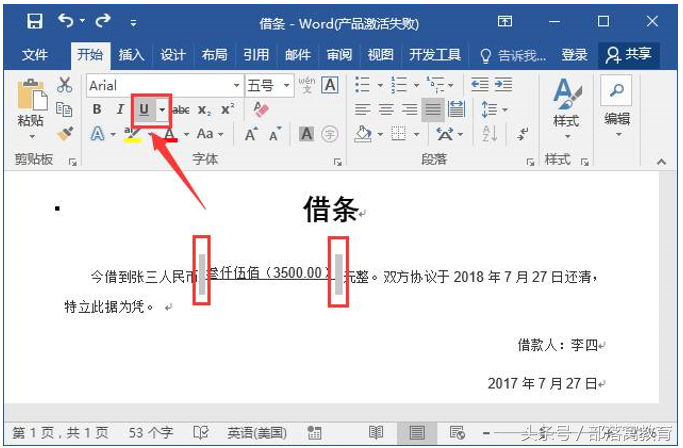 提示:这里也可全选空格及金额区域内容,然后单击两次“下滑线”按钮或按两次Ctrl+U组合键同样可调整下划线距离。