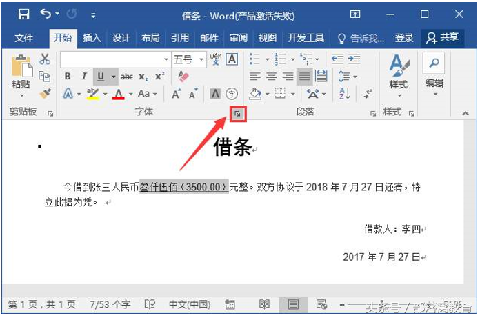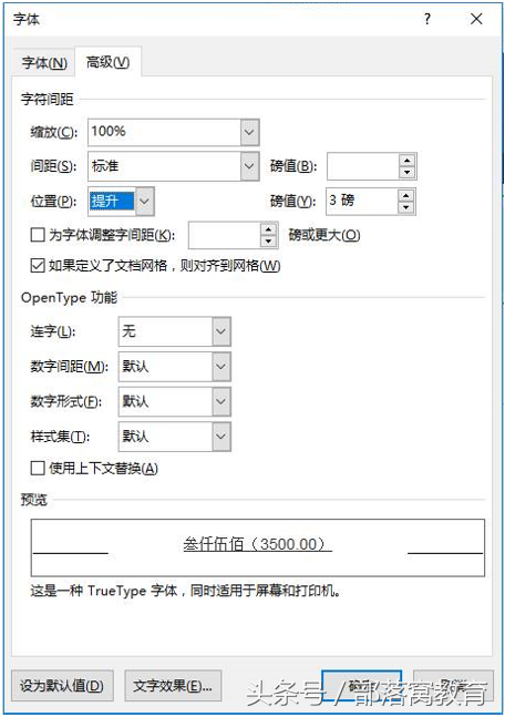(2)打开“字体”对话框。在“高级”选项卡下设置“位置”为“提升”,并可以根据自己需要设定磅值,这里设置为“3磅”,进行距离调整。