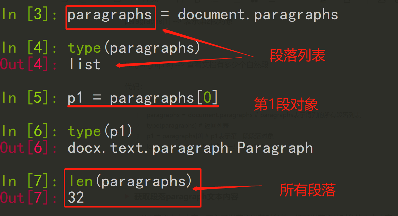 一个document文档包括一个或者多个段落,都在document的paragras属性中,document.paragraphs返回所有段落对象的列表。