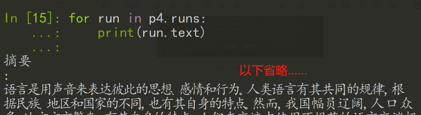 一个段落有多个文本块run对象组成,我们可以通过paragraph.runs获取所有块对象,然后通过.text获取其内容,这里以第4段为例p4 = paragraphs[3]