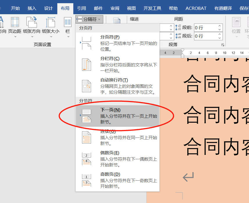 在“布局”菜单的“页面设置”选项卡中,点击“分隔符”,点击“下一页”即可插入分节符,如下图: