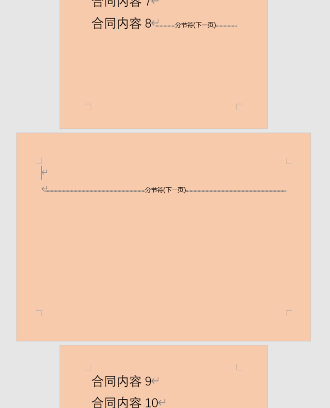假设我们要在一个合同文件内插入一张合同清单表格,因为表格内容多,所以采用横的页面。完成之后合同文档应该是既有竖页,又有横页面的混合文档。