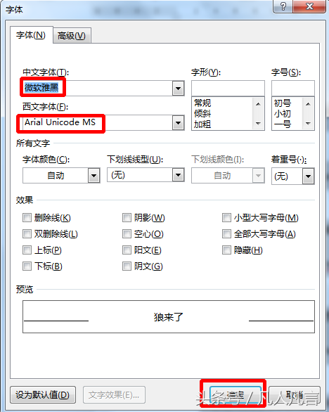 2.工具:Word2013步骤:第一步:全部选中整个文档第二步:点击字体组右下角的斜箭头第三步:在中文字体中选择【微软雅黑】,在西文字体中选择【Arial Unicode MS】第四步:点击【确定】即可注:也可以按ctrl+A全部选中注:字体微软雅黑很清晰、很美观,很适合儿童阅读注:Arial Unicode MS是英文常用的字体