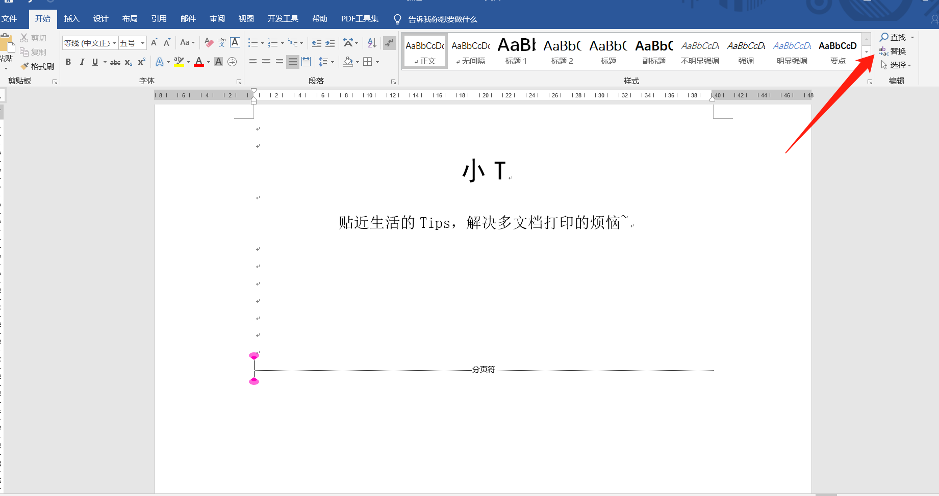 步骤1:在开始界面选项卡找到替换选项(按Ctrl+G也能快速打开)