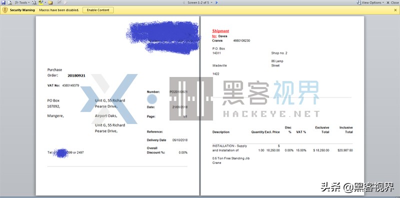根据FortiGuard实验室的说法,被捕获的恶意文档被命名为“eml_-_PO20180921.doc”。在你打开它时,会在窗口顶部看到一个黄色的警告条,旨在诱使你点击“启用内容(Enable Content)”。一旦点击,恶意VBA代码就会在后台执行。