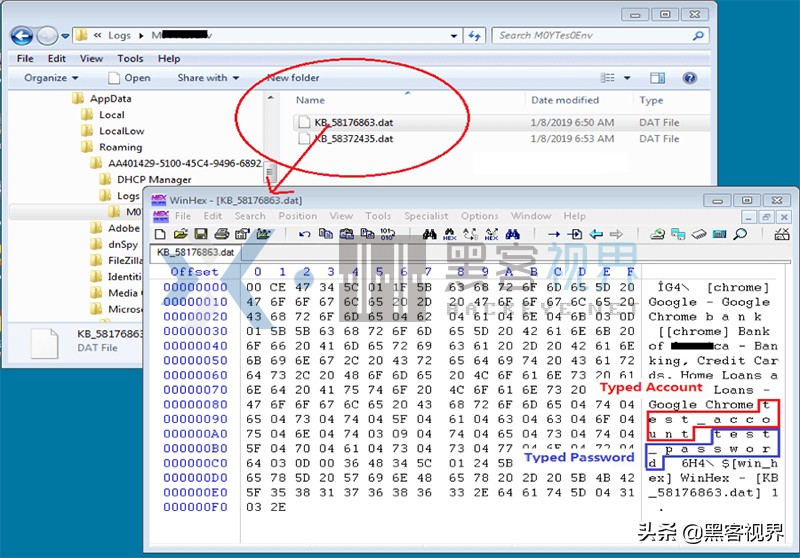 研究人员使用Chrome浏览器打开了一个网上银行网站,并在登录页面上输入了测试用的帐号和密码。测试结果证实,由研究人员输入的所有内容全都被NanoCore获取到,并保存在“Logs”文件夹下的文件中。从这些文件的命名来看,它们试图伪装成Windows更新日志文件。