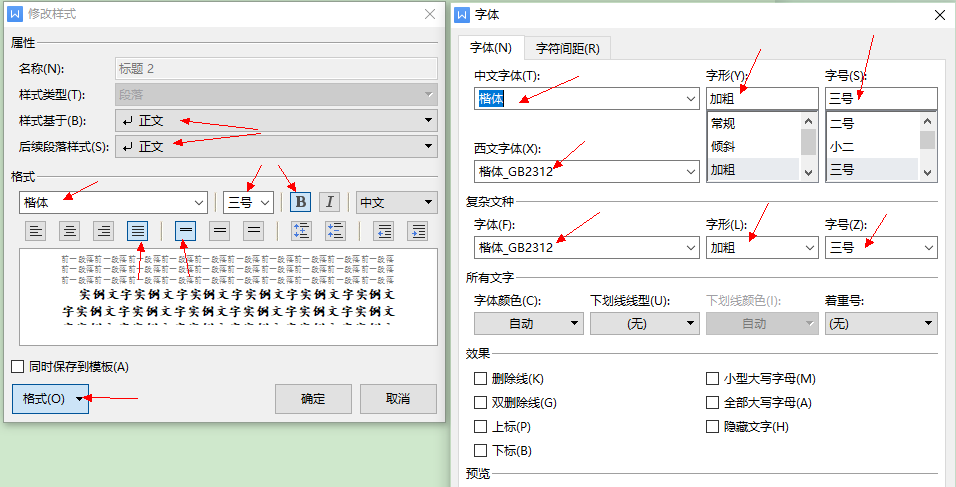 再点击对话框左下角“格式”,分别设置字体和段落。字体对话框设置中文字体、西文字体、复杂文种都为楷体加粗三号。