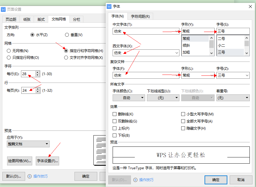 “文档网格”选中指定行和字符网格、每行28字,每页24字。“字体设置”:中文字体、西文字体、复杂文种都为仿宋常规三号。