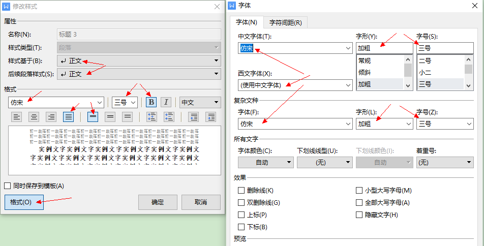 再点击对话框左下角“格式”,分别设置字体和段落。字体对话框设置中文字体、西文字体、复杂文种都为仿宋加粗三号。