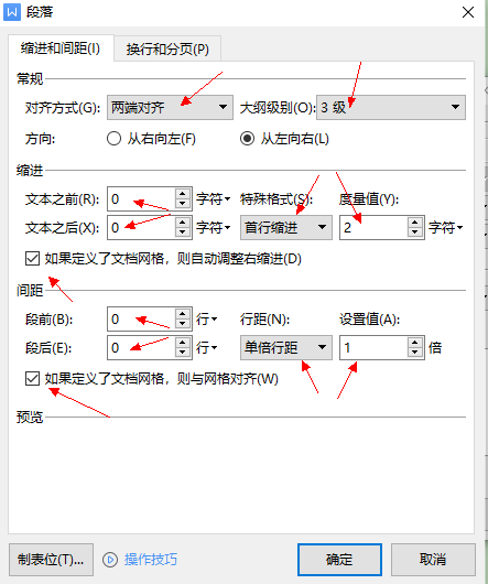 段落主要设置为两端对齐,大纲级别1级;缩进文本之前之后为0,特殊格式为“首行缩进,2字符”;间距段前段后为0,行距单倍行距,1磅;选中“如果定义了文档网格,则与网格对齐”。