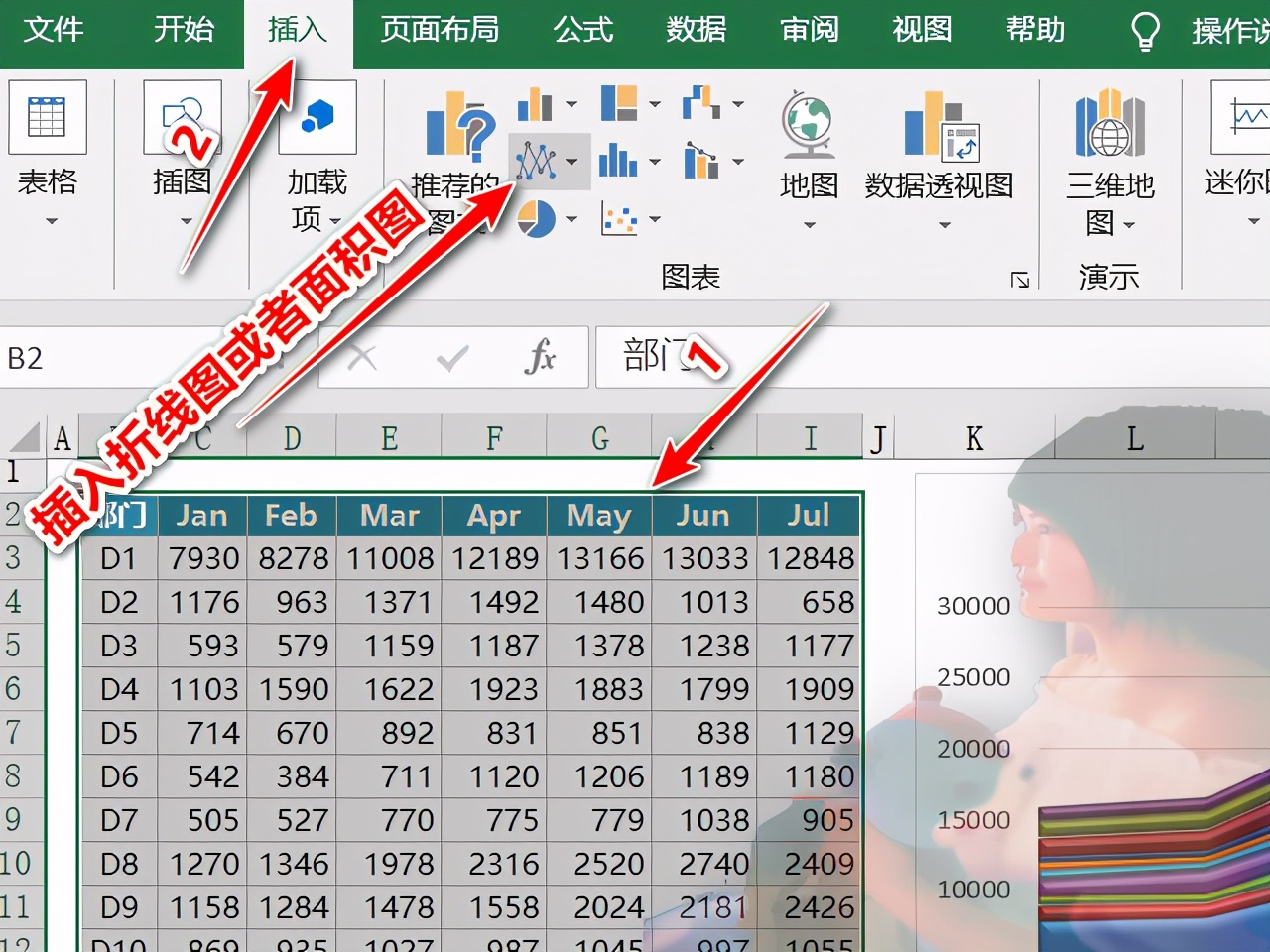 第一步:选中全部数据单击工具栏中选中【插入】-【图表】-【插入折线图或者面积图】如图: