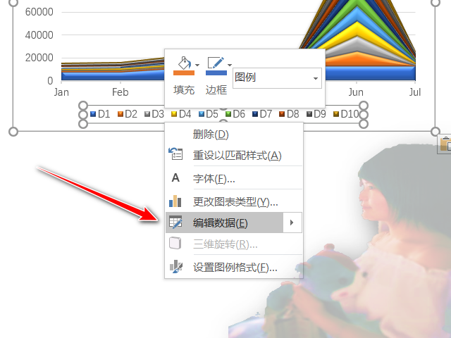 注释:当需要修改文档图表数据,只需要邮寄图表,在弹出得快捷键菜单中选择【编辑数据】命令,如图: