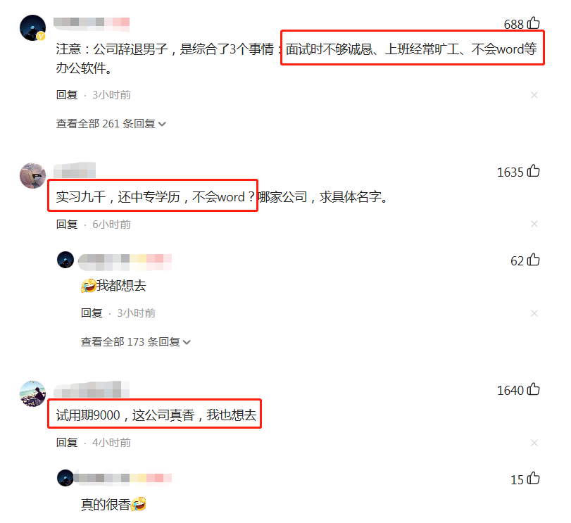 网友们看到后也是议论纷纷:“实习期都9000元了,这公司真香,我也想去”。但还是有理智的网友分析了该小伙儿被辞退的原因“面试时不够诚恳,上班经常旷工,不会基本的办公软件”,所以综合下来,这波儿战公司!