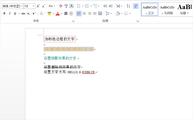 //实例化一个Document对象 Document doc = new Document(); //向文档中添加一个Section对象 Section sec = doc.AddSection(); //在这个section上添加一个段落并给文字加边框 Paragraph p1 = sec.AddParagraph(); TextRange tr1 = p1.AppendText("加粉色边框的文字"); tr1.CharacterFormat.Border.BorderType = BorderStyle.DashDotStroker; tr1.CharacterFormat.Border.Color = Color.Pink; p1.AppendBreak(BreakType.LineBreak); //添加一个新段落并设置文字填充效果 Paragraph p2 = sec.AddParagraph(); TextRange tr2 = p2.AppendText("设置填充效果的文字"); //设置文字前景色 tr2.CharacterFormat.TextColor = Color.Orange; //设置文字背景色 tr2.CharacterFormat.TextBackgroundColor = Color.LightGray; //设置文字缩放比例 tr2.CharacterFormat.TextScale = 150; p2.AppendBreak(BreakType.LineBreak); //添加一个新段落并设置阴影 Paragraph p3 = sec.AddParagraph(); TextRange tr3 = p3.AppendText("设置阴影效果的文字"); tr3.CharacterFormat.TextColor = Color.LightSeaGreen; tr3.CharacterFormat.IsShadow = true; p3.AppendBreak(BreakType.LineBreak); //添加一个新段落并设置简单的文字样式 Paragraph p4 = sec.AddParagraph(); TextRange tr4 = p4.AppendText("设置删除线效果的文字"); tr4.CharacterFormat.IsStrikeout = true; p4.AppendBreak(BreakType.LineBreak); TextRange tr5 = p4.AppendText("设置文字大写: hello, e-iceblue."); tr5.CharacterFormat.IsSmallCaps = true; //使用ClearFormatting()来删除某个TextRange的文字效果 //tr5.CharacterFormat.ClearFormatting(); //保存文档 doc.SaveToFile("文字效果.docx");