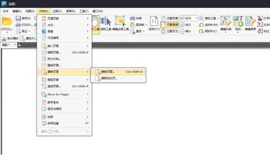 点击软件上方菜单栏中的文档选项,选择删除页面功能。这时,我们就可以进行对空白页面的删除步骤了。