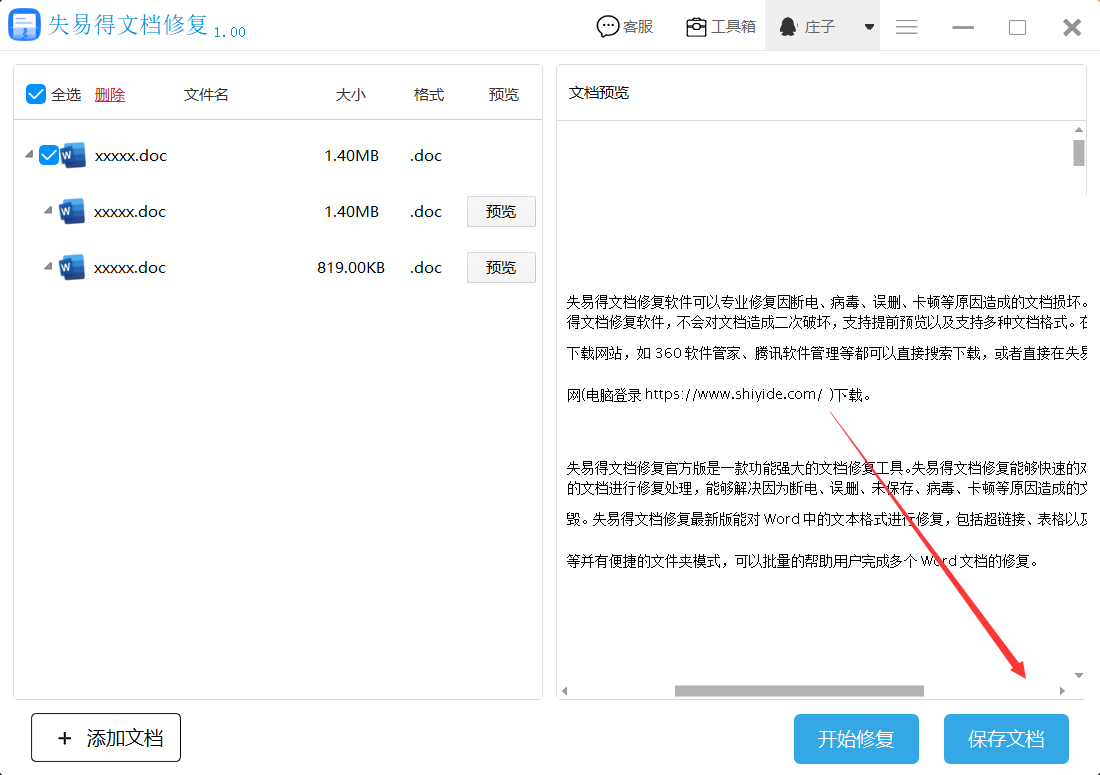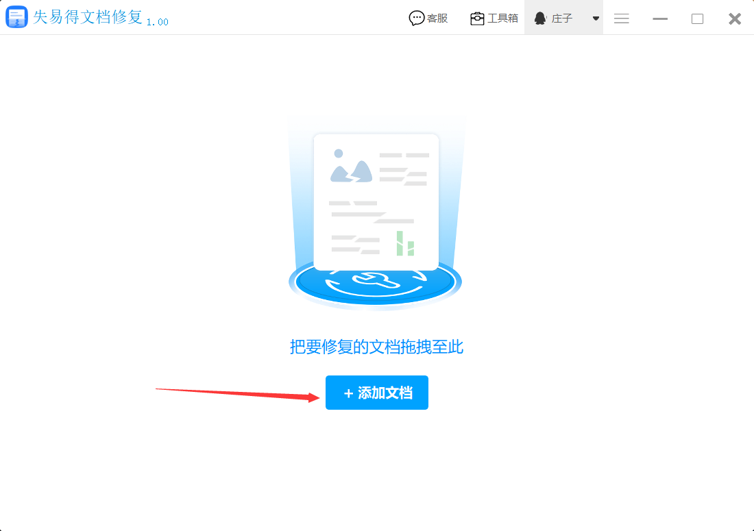 第一步:运行失易得文档修复,直接把文档拖到软件内或者点击“添加文档”。选中要恢复的文件,点击“开始修复”。