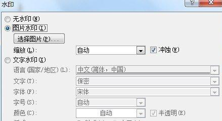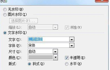 然后在水印的下拉框上面选择“自定义”即可弹出添加水印的对话框,就可以在上面添加文字水印和图片水印了。如图所示: