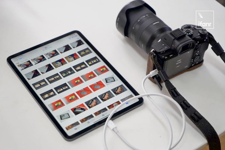 相机直连的用法基本雷同,如下图所示将索尼 A7M3 与 iPad Pro 通过 Type-C 线相连,然后在 iPad 上打开文件 app 浏览并导出相片(手机同理)。然而是最理想的状态,一旦更换相机或移动设备,可能就得用上转接口或不同数据线了。