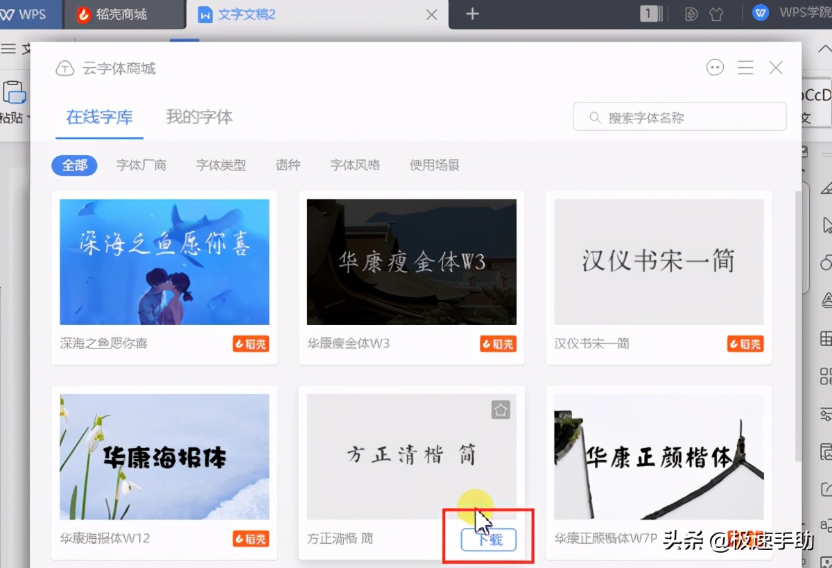 第三步,然后进入【云字体商城】,选择所需要的字体,然后点击右下角的【下载】按钮。