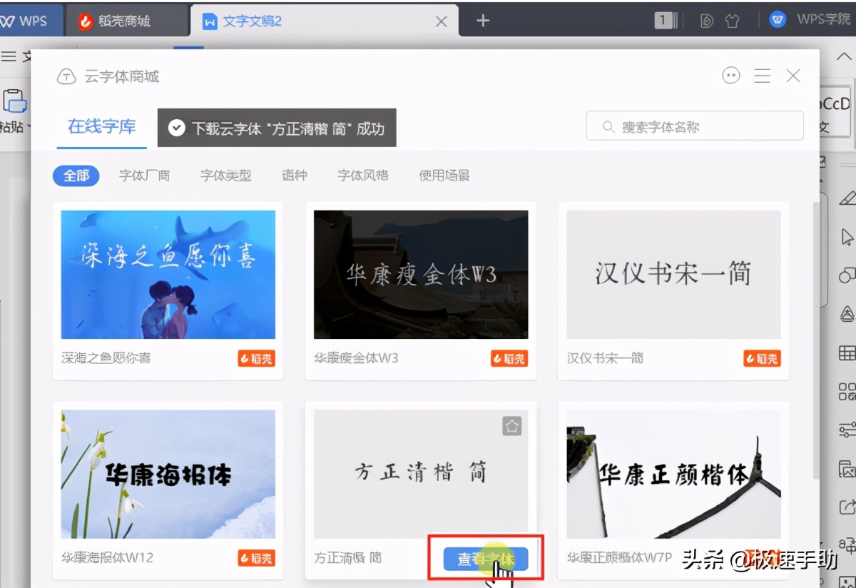 第四步,字体下载完成之后,点击【查看字体】按钮,即可以看到刚才所下载的字体了。
