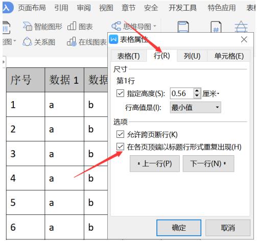 第五步:在弹出窗口的选项栏选择【行】,并勾选“在各页顶端以标题行形式重复出现”点击确定即可: