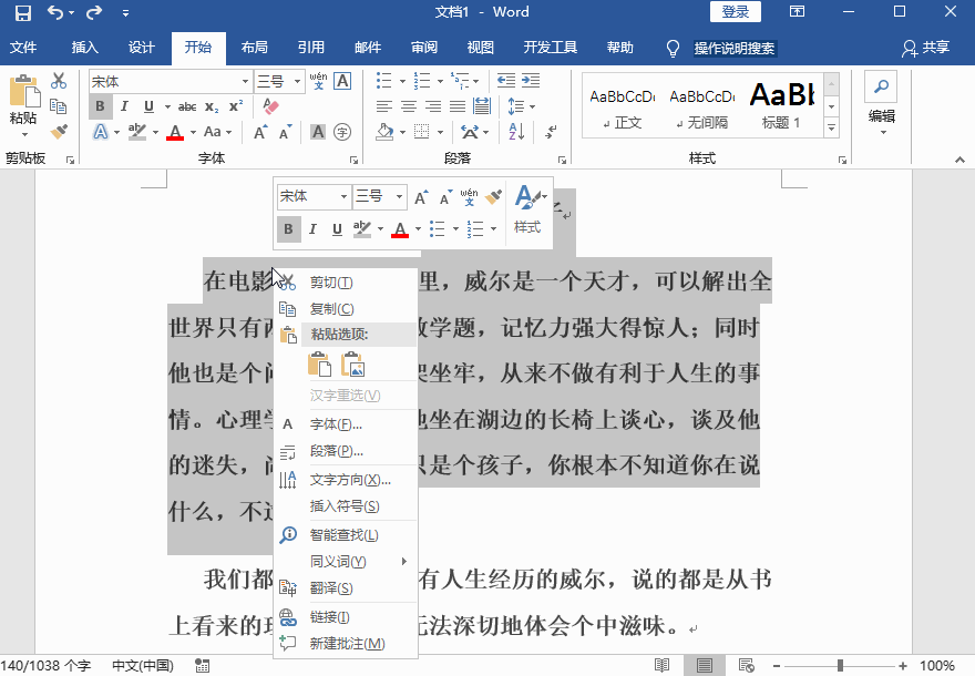 1、选中Word中的一段文字,然后鼠标右击。点击菜单栏中的“字体”。