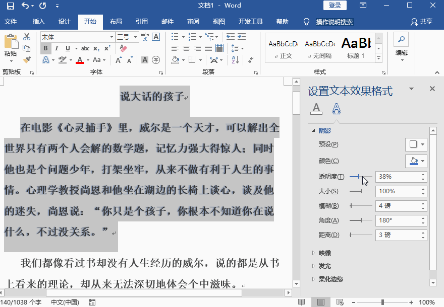3、接着在“设置文本效果格式”界面中,设置字体阴影的透明度、大小、模糊、角度和距离就可以了。