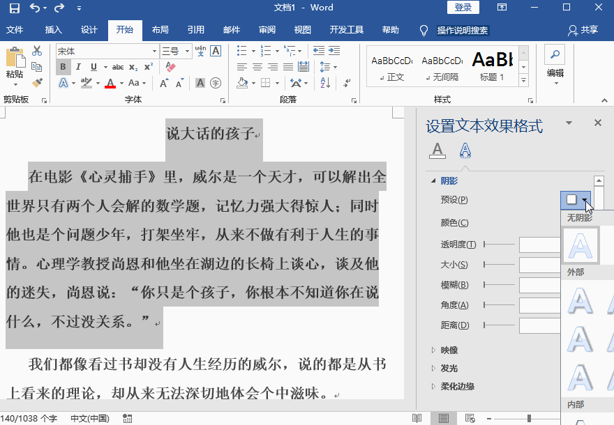 1、在Word的“开始”界面中,点击“字体”栏中的“文本效果和板式”图标。然后点击菜单栏中的“阴影”,点击底部的“阴影选项”。