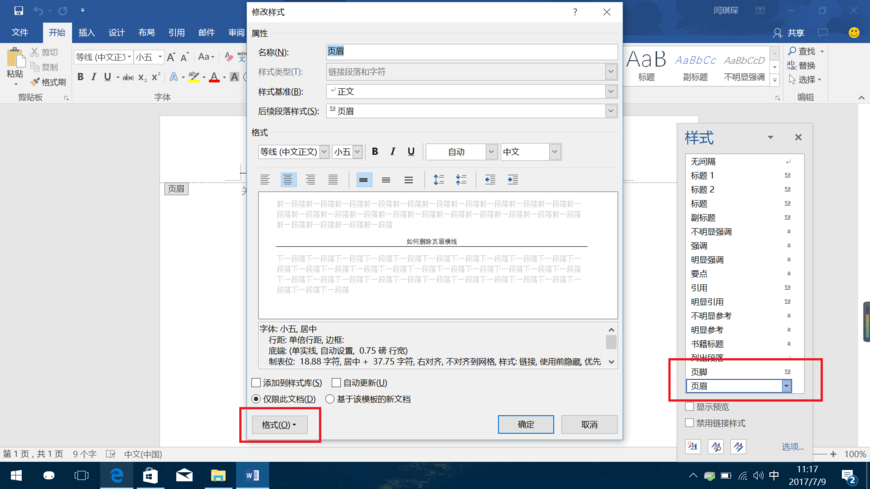 步骤二、点击【页眉】旁边的三角按钮,选择【修改】,进入后我们可以很清楚的看到默认自带的“页眉”样式是怎样的。也就是说页眉自带的样式就是加了一条线和其他各种样式,你仔细看看!