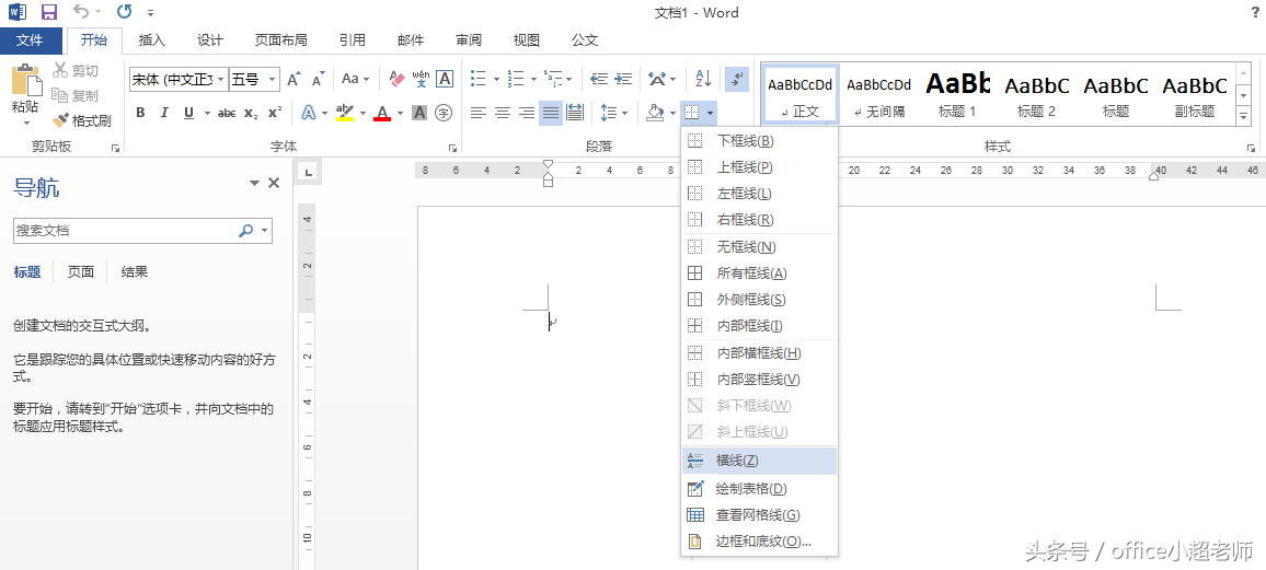 点击[开始]选项卡,找到[段落]命令组中的“田字格”,在其中找到“横线”选项就可以为Word添加横线啦。