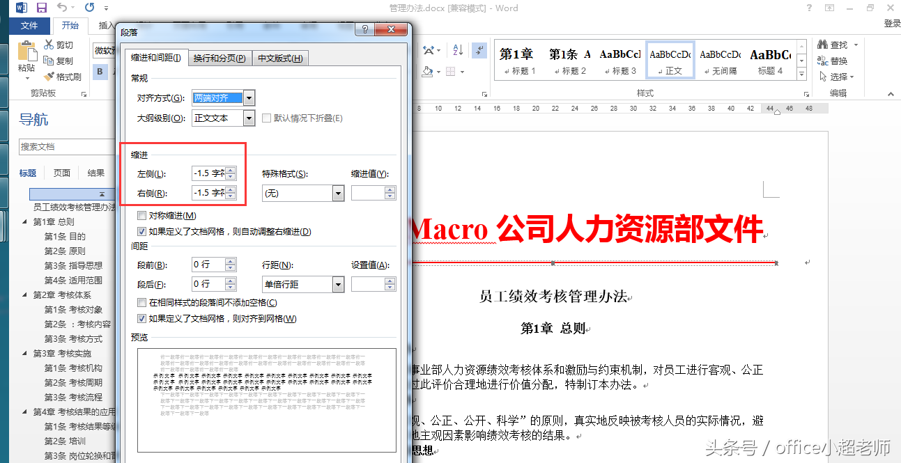 添加完成后,可以同文字段落处理的方法一致,选中对其通过“段落”对话框设置其左右缩进,因为公文里面对于文档有着严格的制作规范。