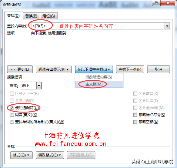 1、Ctrl+A 全选要对齐的姓名文档,利用快捷键 Ctrl+H 打开查找对话框,在查找框内输入<(?)(?)> ,勾选“使用通配符”,在以下项中查找选“主文档”。