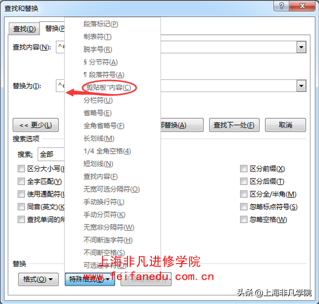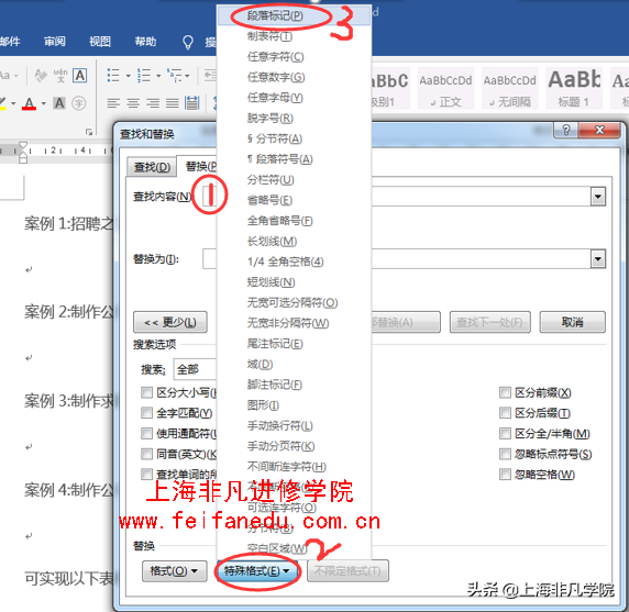 2光标定于替换框内è点选对话框下面的“特殊格式”è段落标记(一次)。