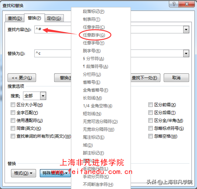 2光标定于查找框内——点选对话框下面的“特殊格式”——任意数字。