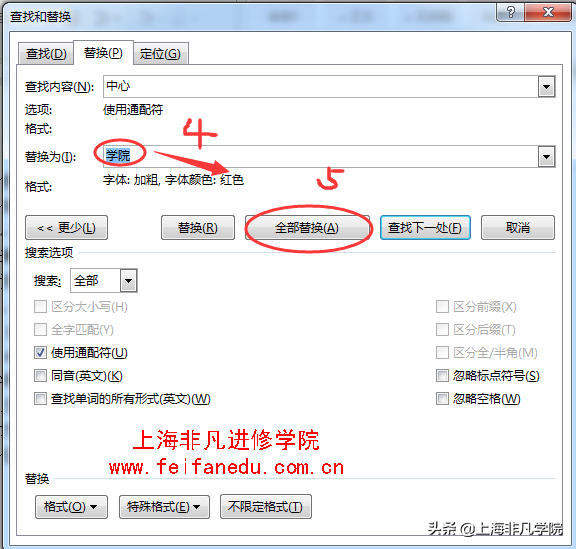 2、选中替换的内容“学院”,点选对话框下面的格式字体,将其格式为红色,加粗。