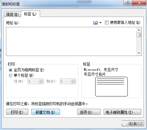Word制作名片步骤6:打开“标签选项”对话框,在“标签供应商”下拉列表中选择“Microsoft”,在“产品编号”列表框中选择需要使用的名片样式,然后单击“确定”按钮关闭对话框,如图6所示。单击“信封和标签”对话框中的“新建文档”按钮关闭对话框。