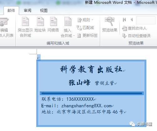 Word制作名片步骤7:此时Word 2013将创建一个新文档,并在新文档中根据设置的名片大小创建表格。选择创建的文本框,按“Ctrl+C”键复制文本框。将制作好的名片内容粘贴至新的文档。