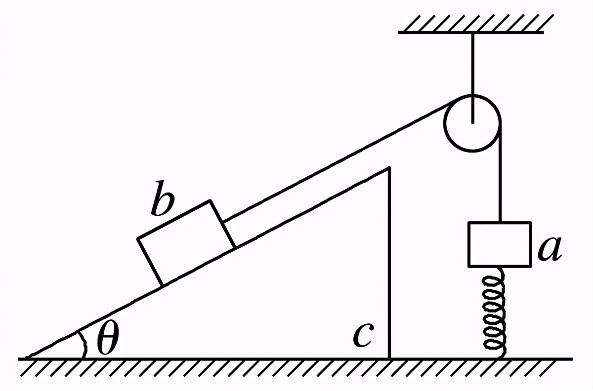 7.如图所示,倾角为θ的斜面体c置于水平地面上,物块b置于斜面上,通过跨过光滑定滑轮的细绳与小盒a连接,连接b的一段细绳与斜面平行,连接a的一段细绳竖直,a连接在竖直固定在地面的弹簧上.现向盒内缓慢加入适量砂粒,a、b、c始终处于静止状态,下列说法正确的是( )
