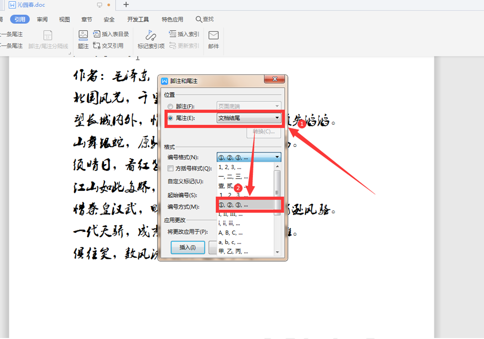 在弹出的对话框中选择【尾注】,在【编号格式】一栏中选择我们认为合适的编号: