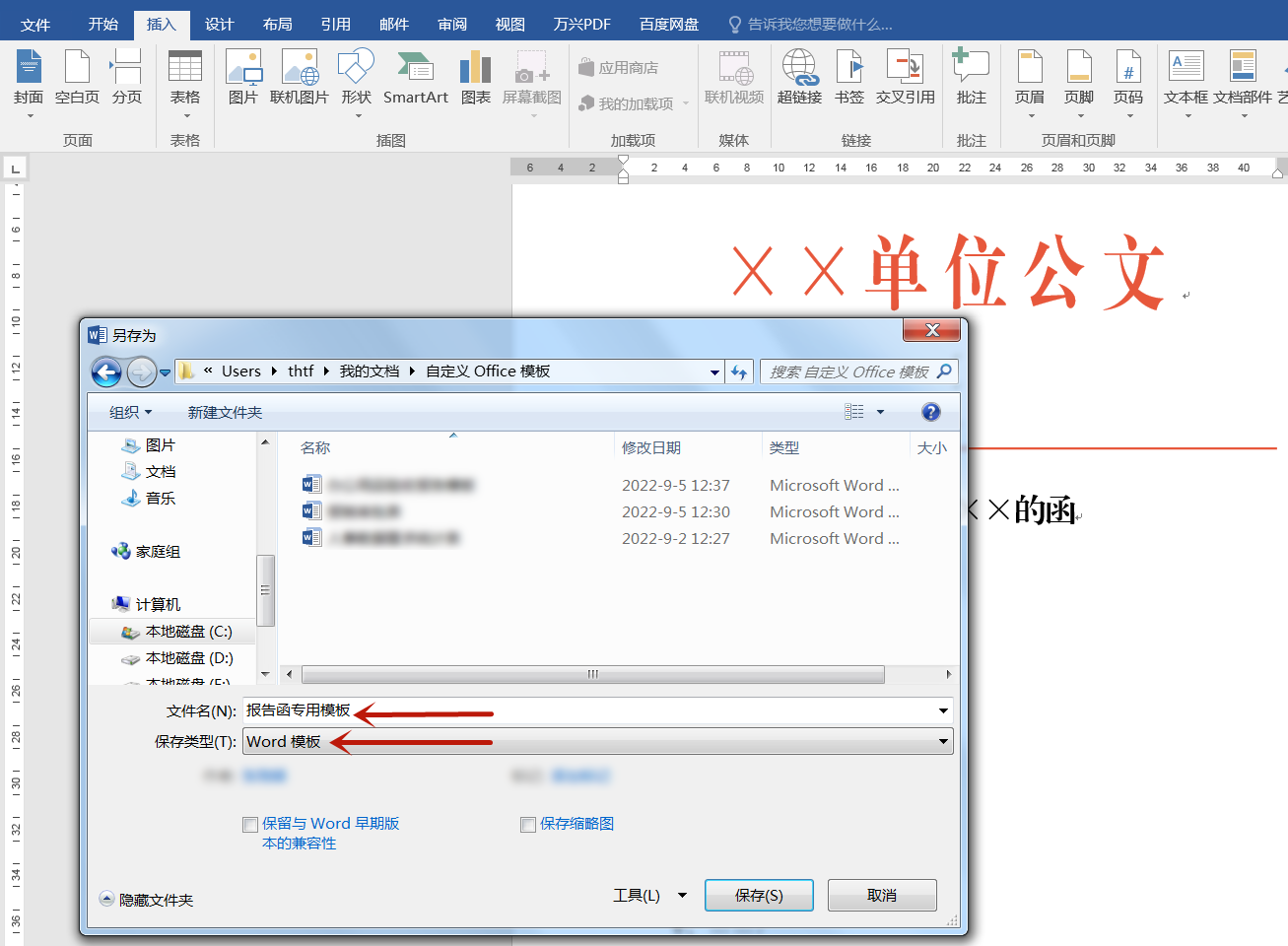第2步:在对话框的“文件名”中录入自己设定好的名字,在下方的“保存类型”中选择“WORD模板”(注意:一定要选择“WORD模板”)。点击“保存”即完成操作。