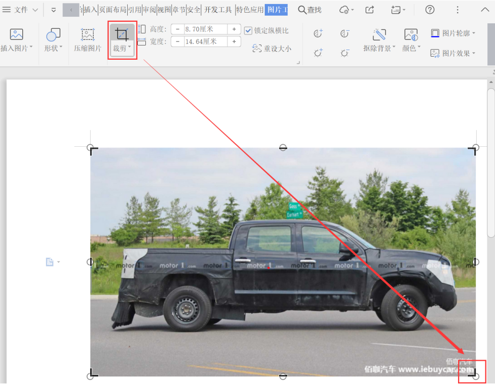 先点击图片,在工具栏会弹出来图片工具的选项,在下拉菜单中选择裁剪】,会弹在图片四角弹出一个小方框: