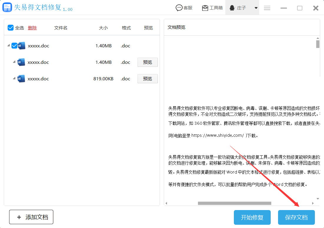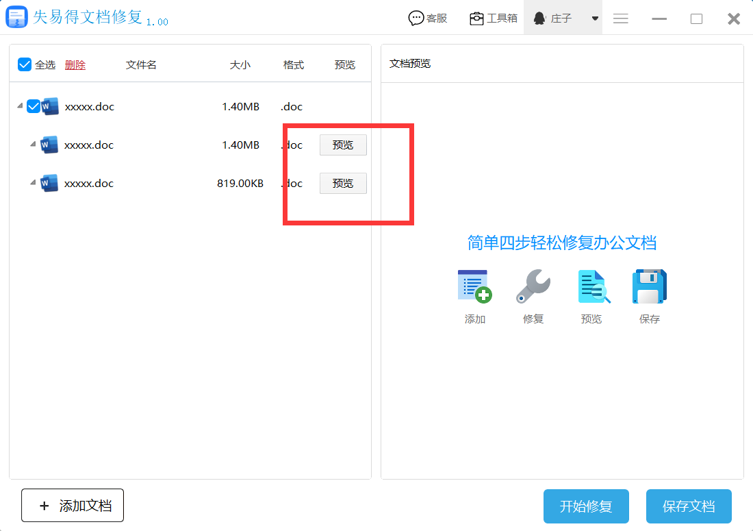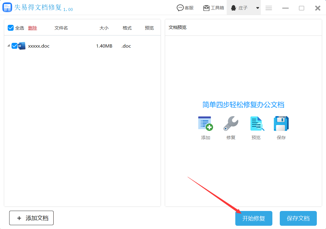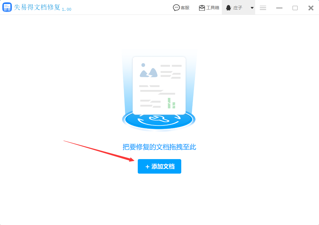 第一步:运行失易得文档修复,将文档直接拖入软件或点击“添加文档”。