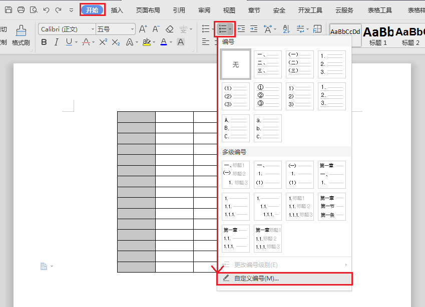 如图,假设我们要在首列添加编号,那么,选中它,单击开始菜单栏下编号栏右侧小箭头,在下拉菜单中选择自定义编号。