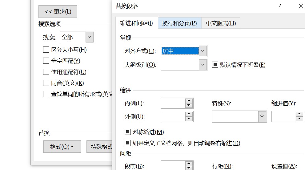 步骤3:在【替换为】一栏中,单击【格式】→【段落】→【对齐方式】,选中【居中】,然后点【全部替换】即可。