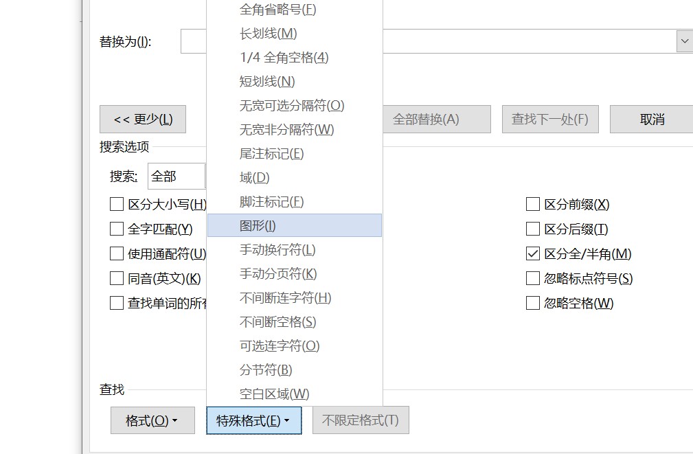 步骤2:在【查找内容】一栏中输入【^g】这里^g代表图片,^可以按shift+6输入,或者单击【更多】→【特殊格式】→【图形】