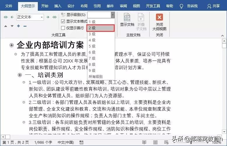 步骤三:选择”大纲显示“选项卡,在”显示级别“中设置标题级别,标题样式1就设置1级,标题样式为2,就设置显示2级......。