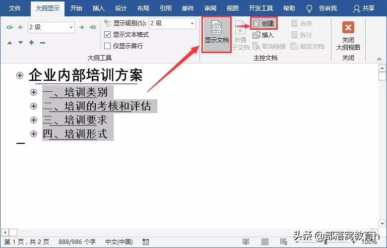 步骤四:选择要拆分的模块,点击【显示文档】-【创建】按钮。
